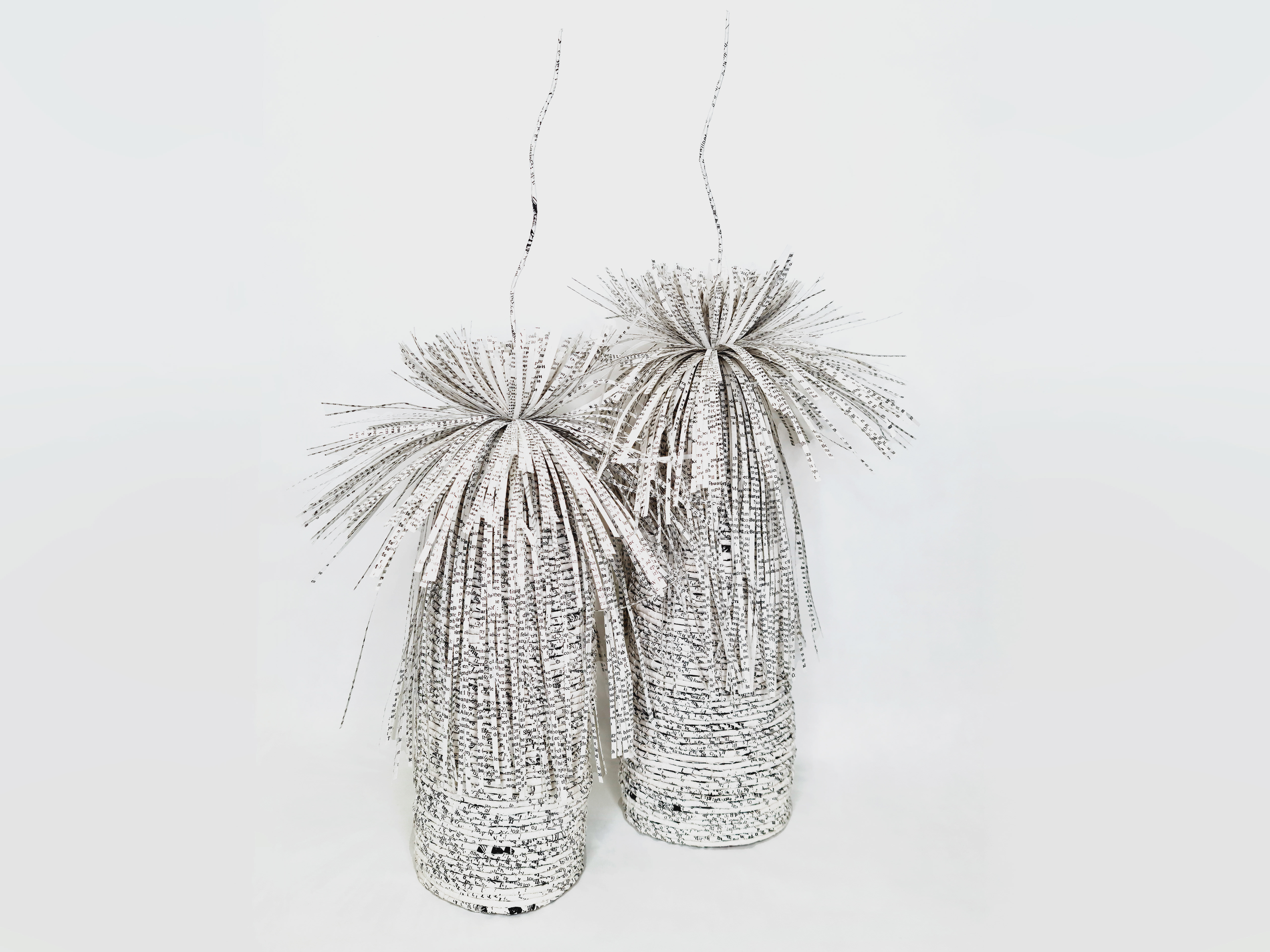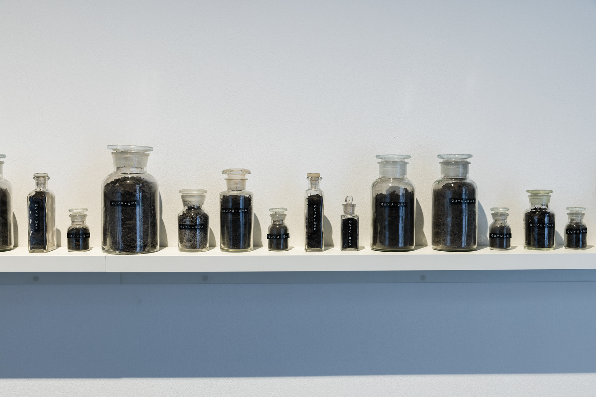 Lee alchemises the paper of this book to create meaningful forms. Here, she presents a grass tree which she wove from the book’s pages to recreate this flourishing species that ‘thrives under elemental forces of deconstruction and reconstruction.’ Working with fire, Lee also presents two related series. One is an installation titled article-particle (Guyu-Gwa) made up of pigment jars labelled with the Gulumerridjin word for fire, in which the ashes of Reed’s text are contained.